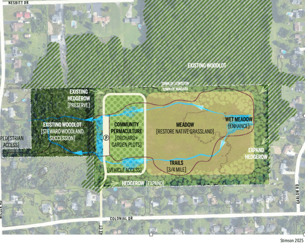 The plan includes winding nature trails through pollinator meadows and reforested areas, also restored habitat for local wildlife by removal or non-native species and replacement with native plants and a community eco-garden. The 26 acre parcel is located east of Miller Road and north of Colonial Drive in the Town of Niagara. Acquisition of the property was made possible by a generous grant funded by the Niagara River Greenway Environmental Standing Committee, and generous donations.